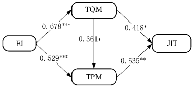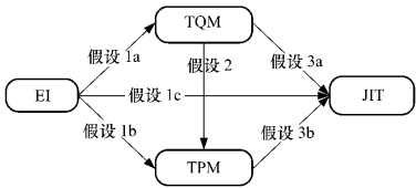 EI 直接推动 TQM 和 TPM,但需通过二者间接影响 JIT;